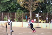 写真は、新人体育大会でのソフトテニス部の試合の様子です。ホームページ上で写真をク...
