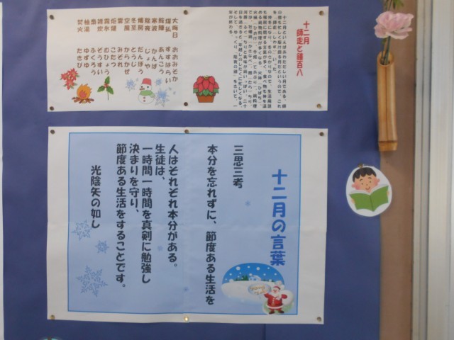 令和7年11月28日(金) 公開日 2025/11/28 更新日 2025/11/28 今日の八條中学校 週明けは12月のスタート! しえん学級と2年生の期末試験が終わりました。3年生は忙しい11月を締めくくりました。3年生の保護者の皆様には三者面談でお世話になりありがとうございました。来週は学級閉鎖を終えた1年生に会えるのが楽しみです。12月も頑張っていきましょう。写真は図書室前の掲示物です。
