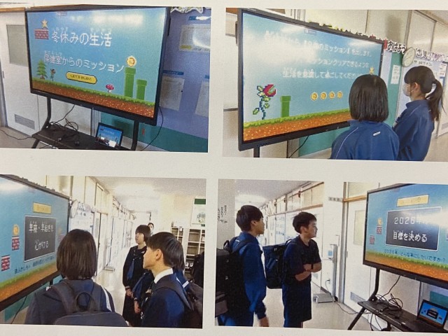 学期末、生徒昇降口付近モニターに「冬休みの生活 ~保健室からのミッション~」を映していました。①「早寝・早起きを心がける」 ②「かぜ予防対策をしっかり行う」 ③「毎日、軽い運動をする」 ④「スマホやゲームは時間を決めてやる」 ⑤「SNSを使うときは、ルールをしっかり守る」 ⑥「勉強や宿題は計画的にやる」 ⑦「自分から進んで家の手伝いをする」 ⑧「2026年の目標を決める」 以上です。冬休み中、ミッションクリアできるような生活を意識して過ごしてください。(写真は先日撮影したものです。)