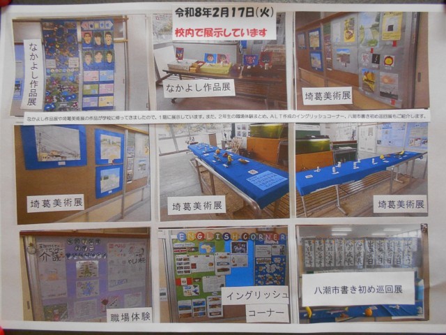 令和8年2月17日(火) 公開日 2026/02/17 更新日 2026/02/17 今日の八條中学校 校内で展示しています なかよし作品展や埼葛美術展の作品が学校に帰ってきましたので、1階に展示しています。また、2年生の職場体験まとめ、ALT作成のイングリッシュコーナー、八潮市書き初め巡回展もご紹介します。