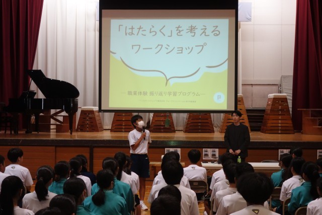 【2学年】「働く」を考えるワークショップ 公開日 2025/09/12 更新日 2025/09/12 2学年 9月11日(木)は5・6時間目はパーソルホールディングス株式会社の社員の方をお招きし、社会体験チャレンジの事後学習を実施しました。社会体験チャレンジで経験したことを振り返り、ワークショップを通して学びを深めました。 2年生