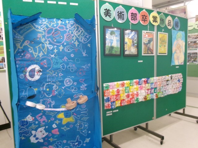 現在、職員用昇降口のスペースで、美術部の卒業作品展が開催されています。