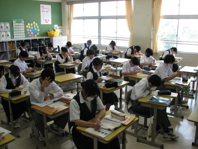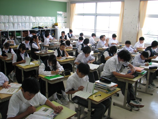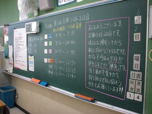 今日は第1回定期テストの2日目です。1時間目は、3年生はテスト、1・2年生はテスト勉強の時間でした。